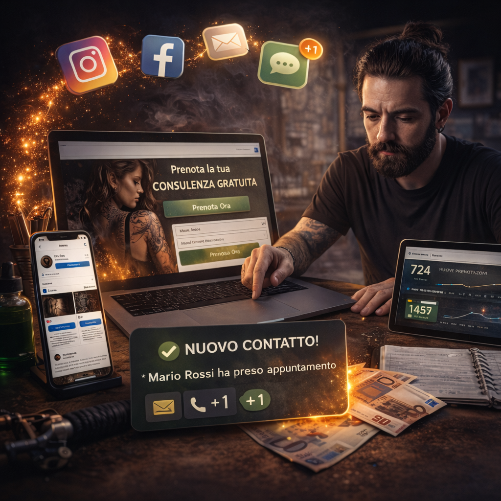 ATTENZIONE: In questa video lezione scoprirai qual è il vero motivo per cui molti tatuatori faticano a riempire l’agenda e cosa stanno facendo oggi gli studi più strutturati per ricevere nuove richieste di tatuaggi ogni settimana, senza dover abbassare i prezzi o dipendere solo da Instagram.