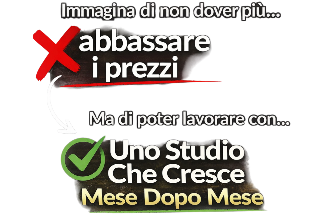 Lo stesso metodo che permette agli studi più ambiziosi di ottenere più visibilità online e attirare clienti migliori, distinguendosi da chi svende il proprio lavoro pur sembrando avere sempre lo studio pieno.